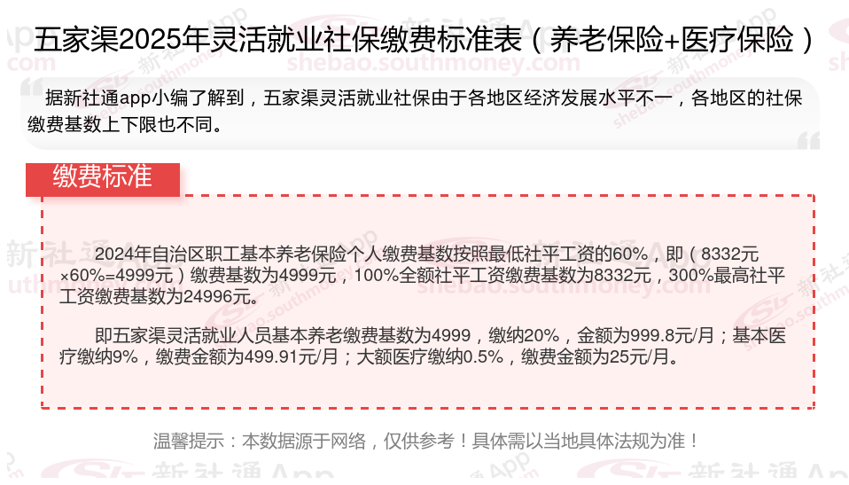 那么,五家渠灵活就业人员社保缴费标准2024-2025最新来了,交社保有什么好处?根据新社通app-社保缴费查询工具提供的2025社保缴费标准详情数据: