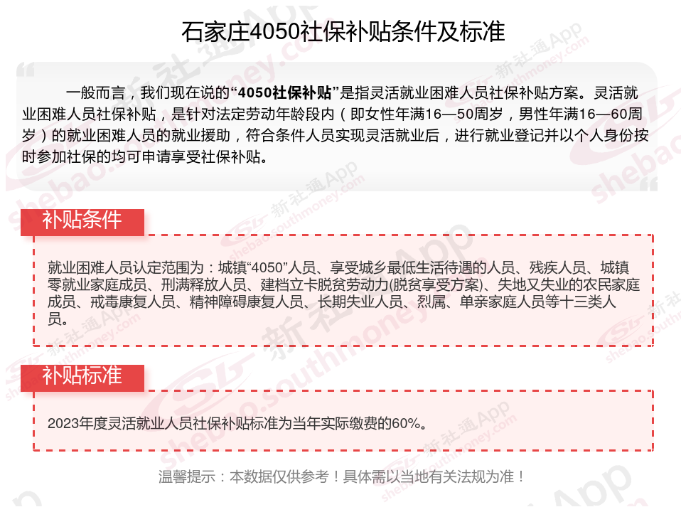 一、石家庄4050社保补贴标准及条件2025年最新消息