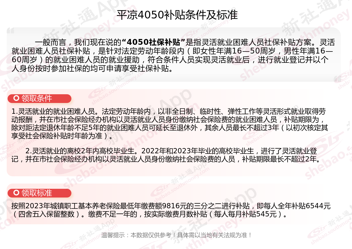 一、2025年平凉4050社保补贴标准及条件是多少?