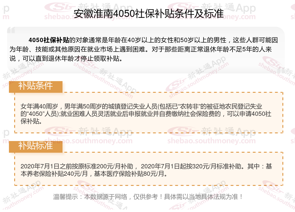 二、2025年安徽淮南4050社保补贴标准及条件,最新如下:
