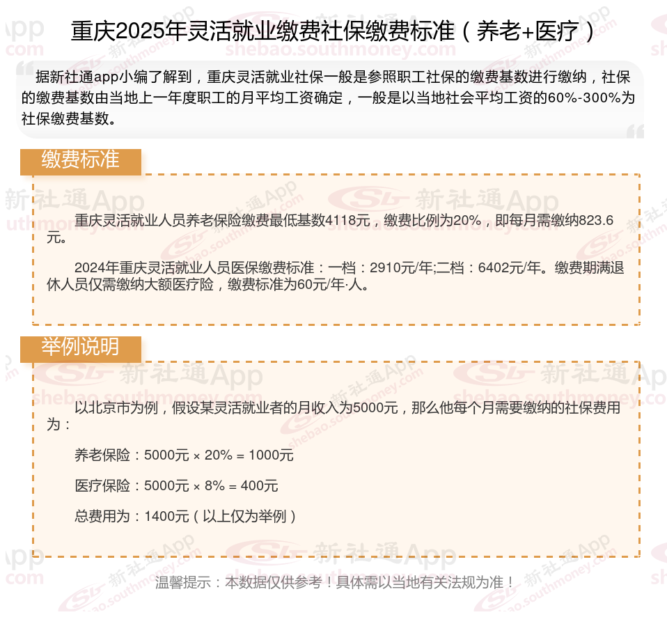 据新社通app数据显示,2024-2025年重庆灵活就业人员养老保险的缴费标准是根据缴费基数来确定的: