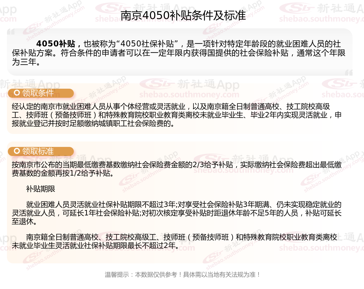 2025南京4050补贴主要针对的是年龄在40岁以上的女性和50岁以上的男性,这些人群通常因为年龄较大而面临就业困难。
