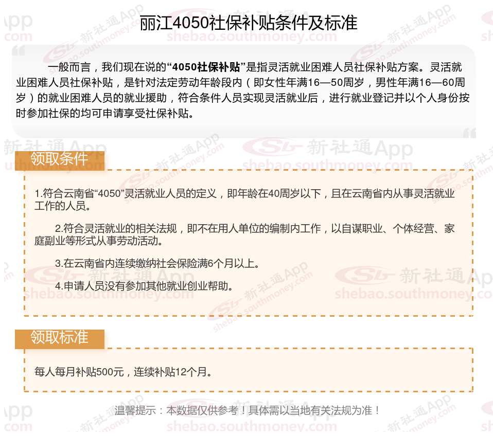 二、2025年丽江4050社保补贴标准及条件,最新如下: