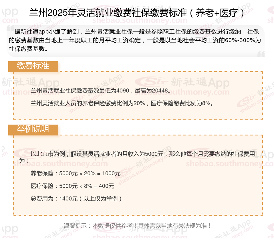 兰州灵活就业社保缴费基数最低为4090,最高为20448。