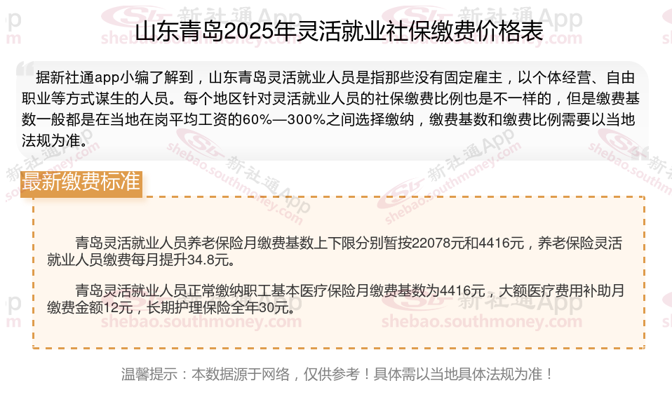 据新社通app数据显示,山东青岛灵活就业人员养老保险缴费基数2024-2025年最新标准如下: