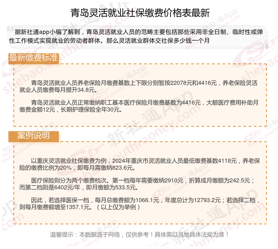 据新社通app数据显示,青岛灵活就业养老保险缴费基数2024-2025年最新标准如下: