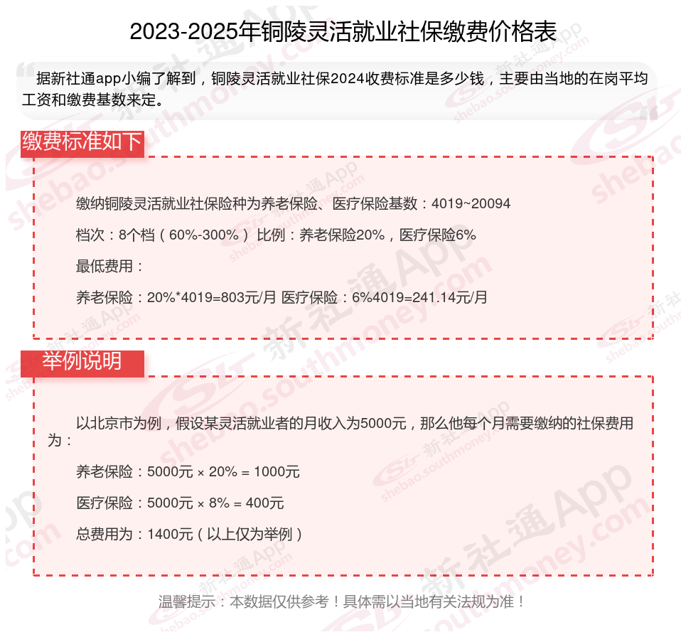 铜陵社保缴费多少钱?下表是2024-2025年铜陵社保费用明细参考,根据新社通app-社保缴费查询工具提供的最新数据如下: