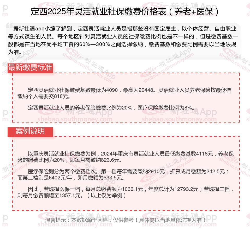 据新社通app数据显示,定西灵活就业养老保险最低缴费基数为:4317元;个人的缴费比例分别为:20%;