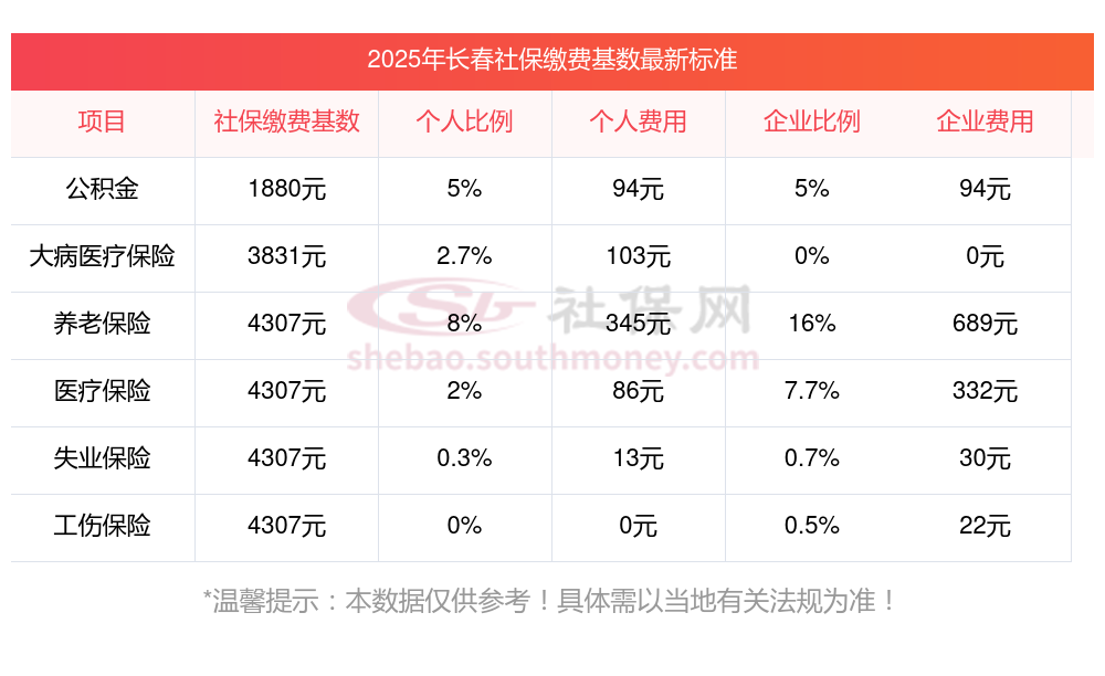 长春2025年社保缴费个人和公司各承担多少?长春五险一金每月最低交多少?下表是2025年长春社保费用明细参考,新社通app-社保缴费查询工具提供的最新数据如下: