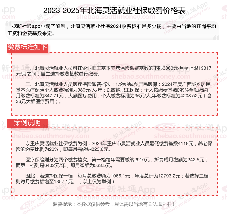 据新社通app数据显示,北海灵活就业养老保险缴费基数2024-2025年最新标准如下: