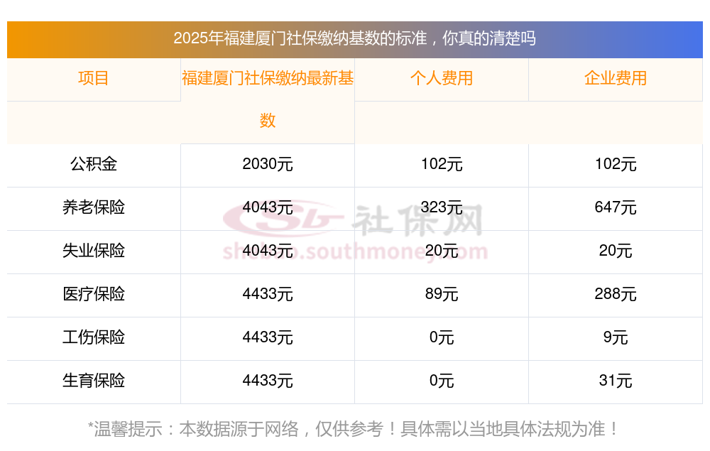2025年福建厦门社保缴费多少钱?下表是2023-2024年福建厦门社保费用明细参考,新社通app-社保缴费查询工具提供的最新数据如下: