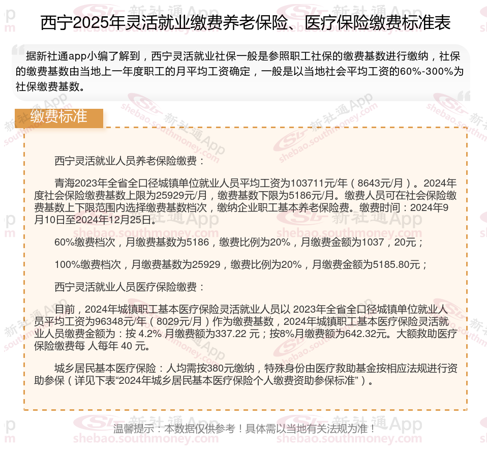 一、2025年西宁灵活就业人员社保养老+医保缴费标准一年多少钱?