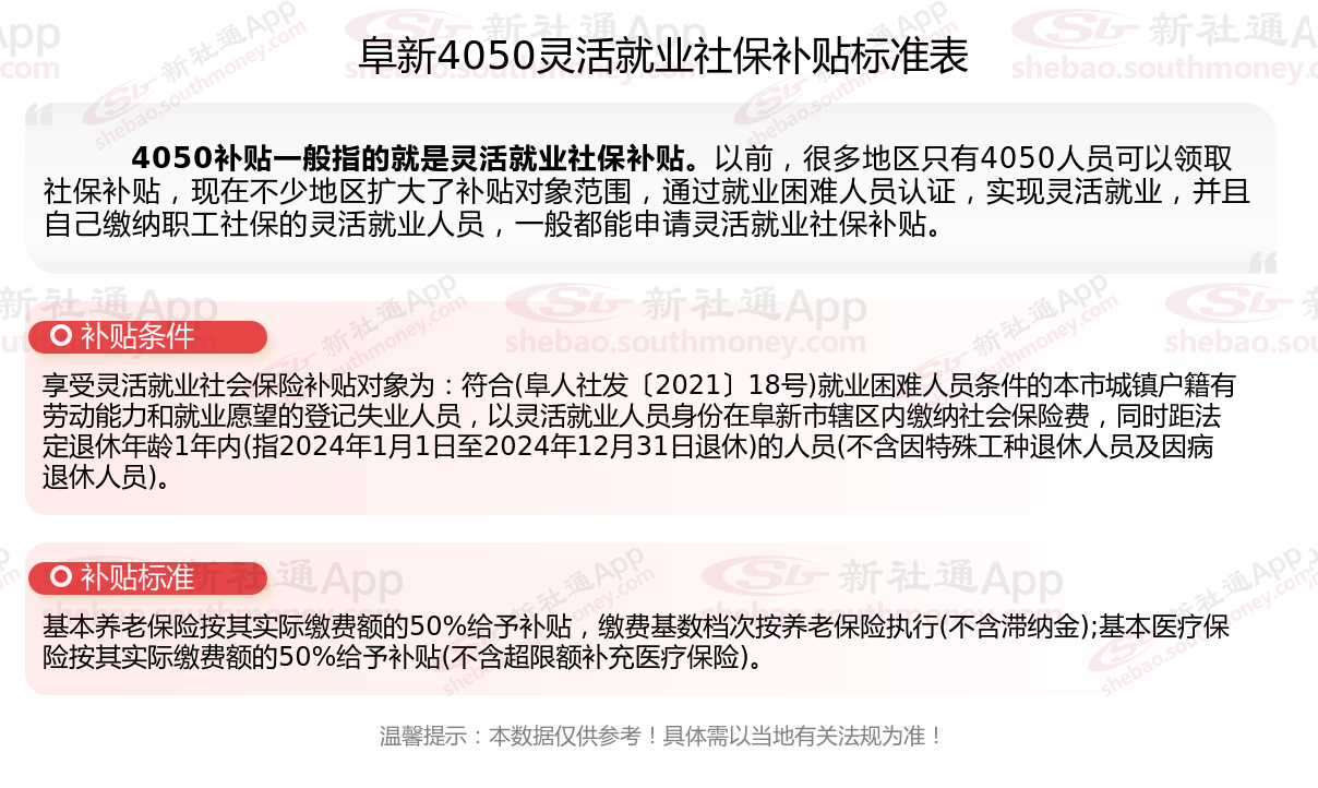 二、2025年阜新4050社保补贴标准及条件,最新如下: