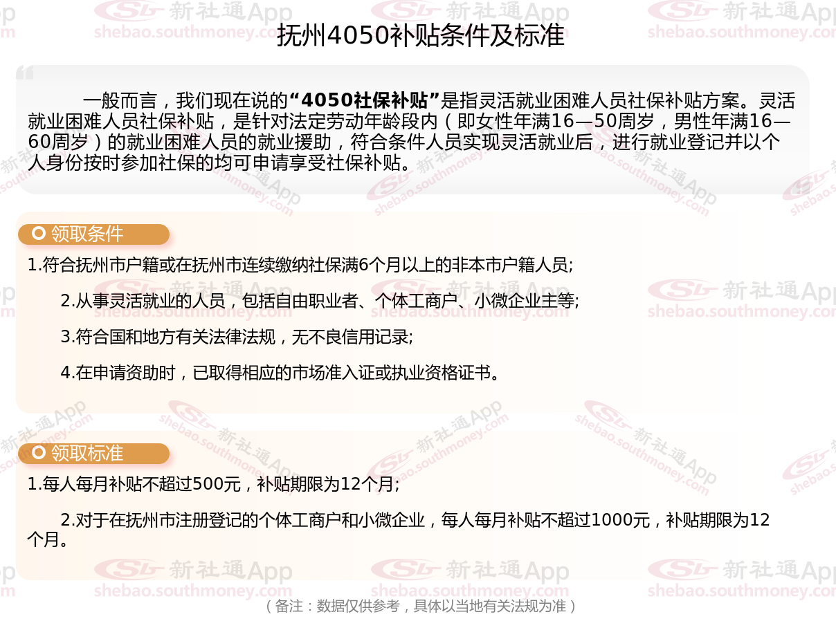 抚州4050社保补贴多少钱一个月?抚州4050社保补贴2025年最新标准是多少?2025抚州4050补贴主要针对的是年龄在40岁以上的女性和50岁以上的男性,这些人群通常因为年龄较大而面临就业困难。