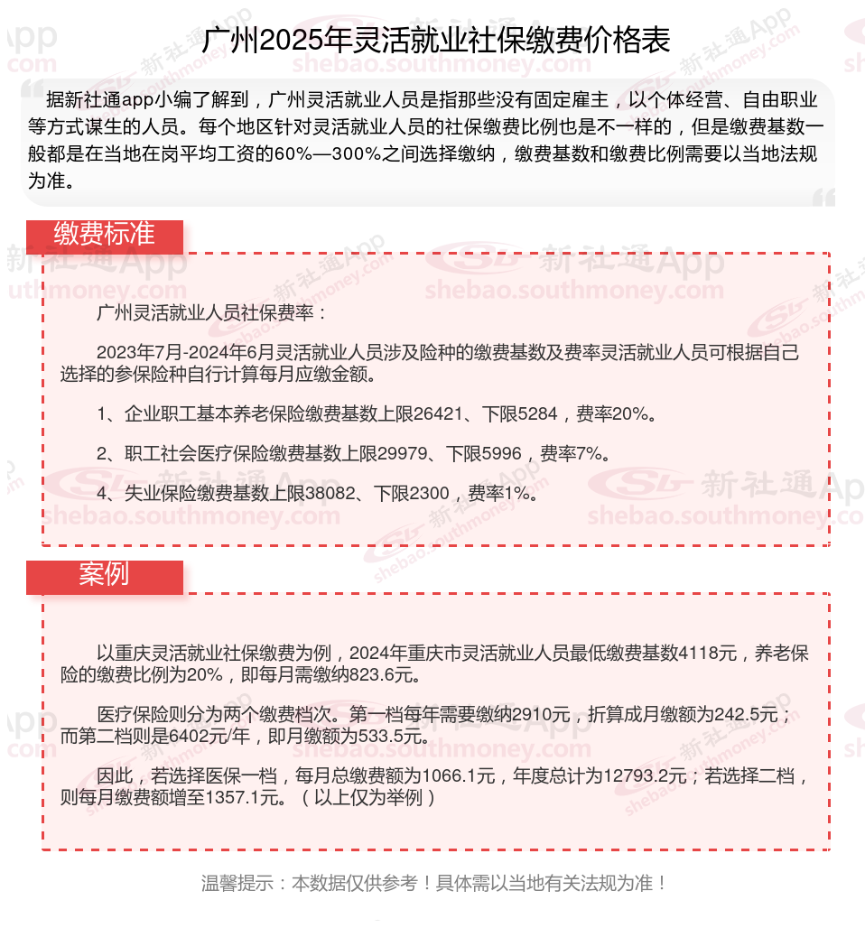 据新社通app数据显示,广州灵活就业养老保险缴费基数2024-2025年最新标准如下: