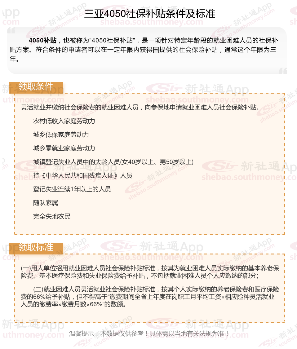 2025三亚4050补贴主要针对的是年龄在40岁以上的女性和50岁以上的男性,这些人群通常因为年龄较大而面临就业困难。