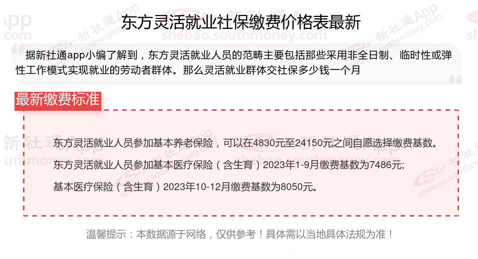 那么,自由职业者社保是多少钱一个月 东方灵活社保交多少钱?根据新社通app-社保缴费查询工具提供的2025社保缴费标准详情数据: