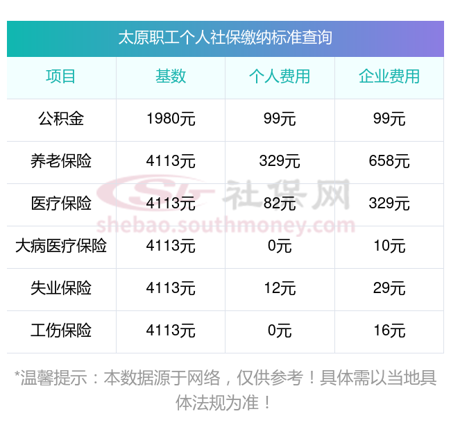 太原社保多少钱一个月?下面和新社通-app小编一起来看看太原最低标准社保费用明细参考,新社通app-社保缴费查询工具提供的最新数据如下: