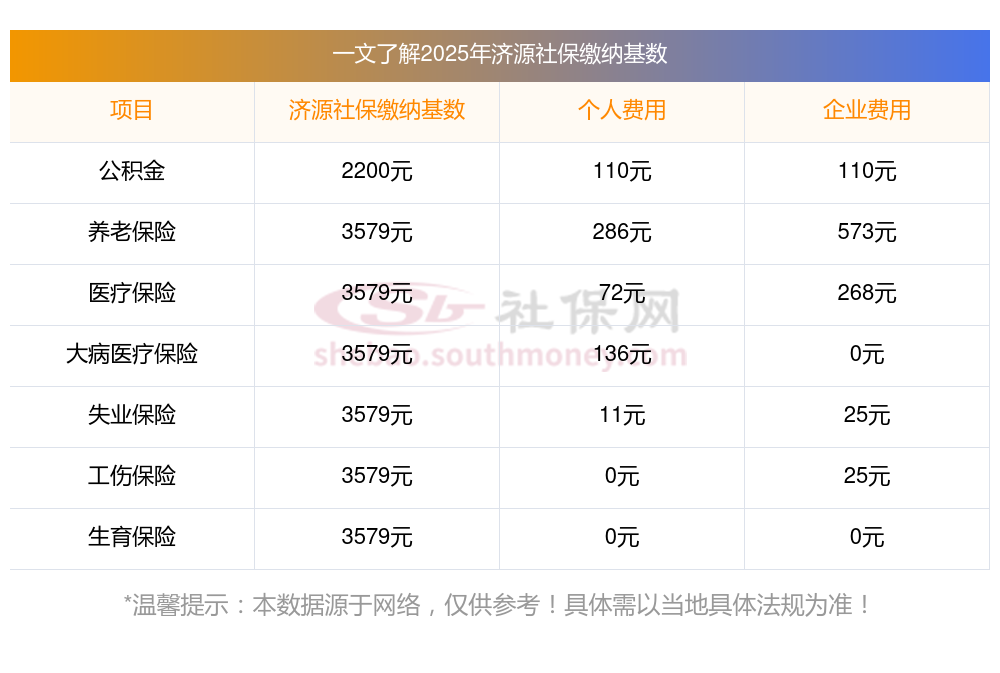 2025年济源五险缴费标准是多少,2025年济源社保缴费多少钱?下表是2025年济源社保费用明细参考,新社通app-社保缴费查询工具提供的最新数据如下: