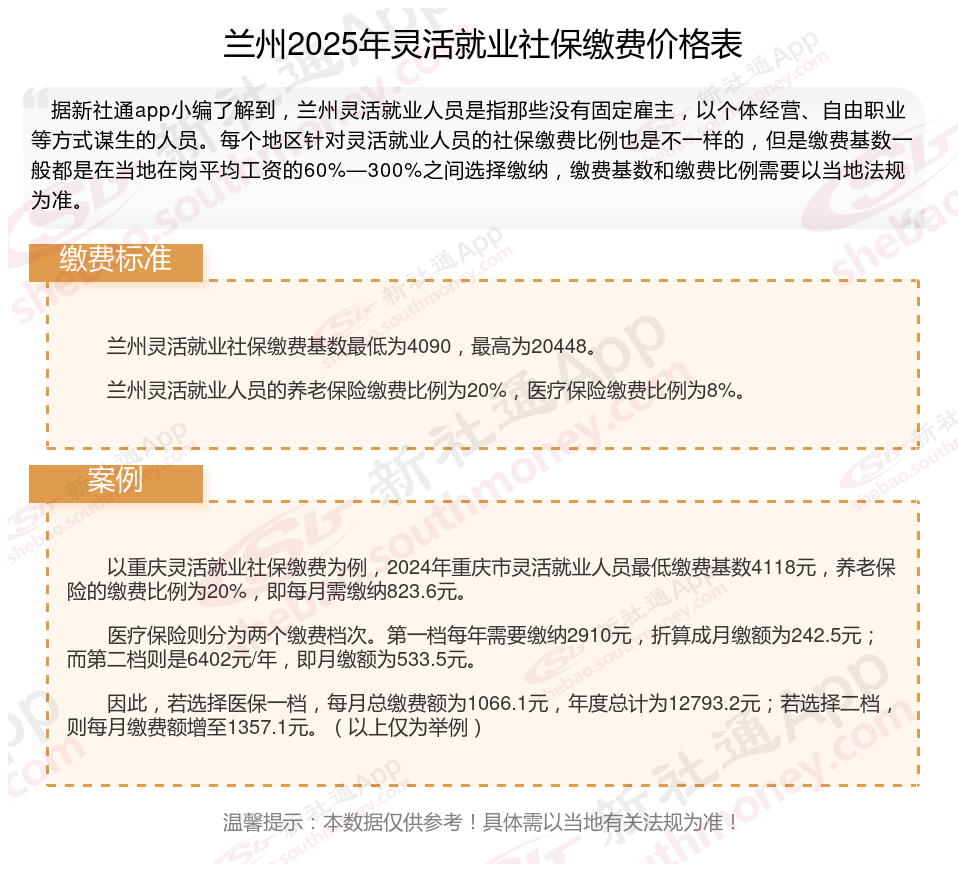 据新社通app数据显示,2024-2025年兰州灵活就业人员养老保险的缴费标准: