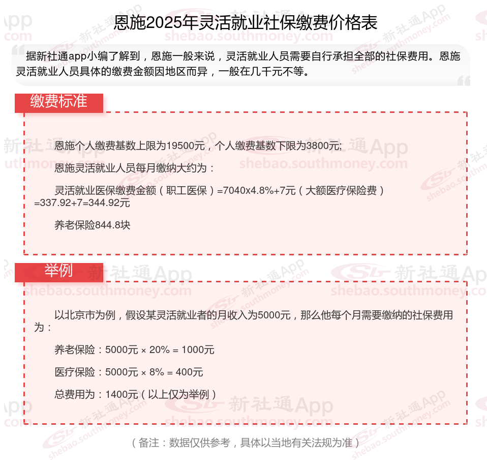 恩施个人缴费基数上限为19500元,个人缴费基数下限为3800元;
