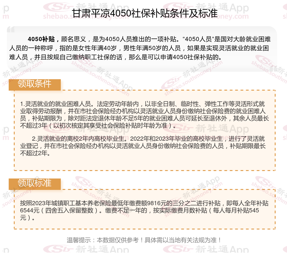 一、2025年甘肃平凉灵活就业4050社保补贴标准及条件是什么(灵活就业4050社保补贴多少钱)