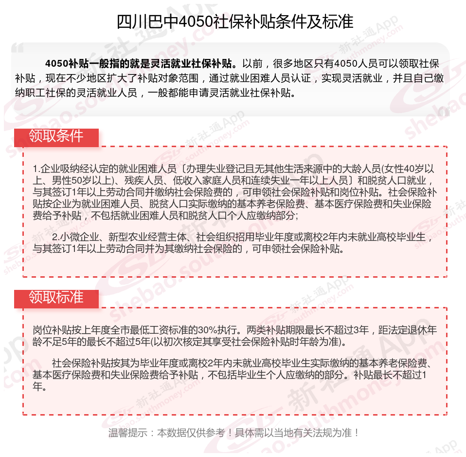 一、2023-2024年四川巴中4050社保补贴标准及条件,最新如下