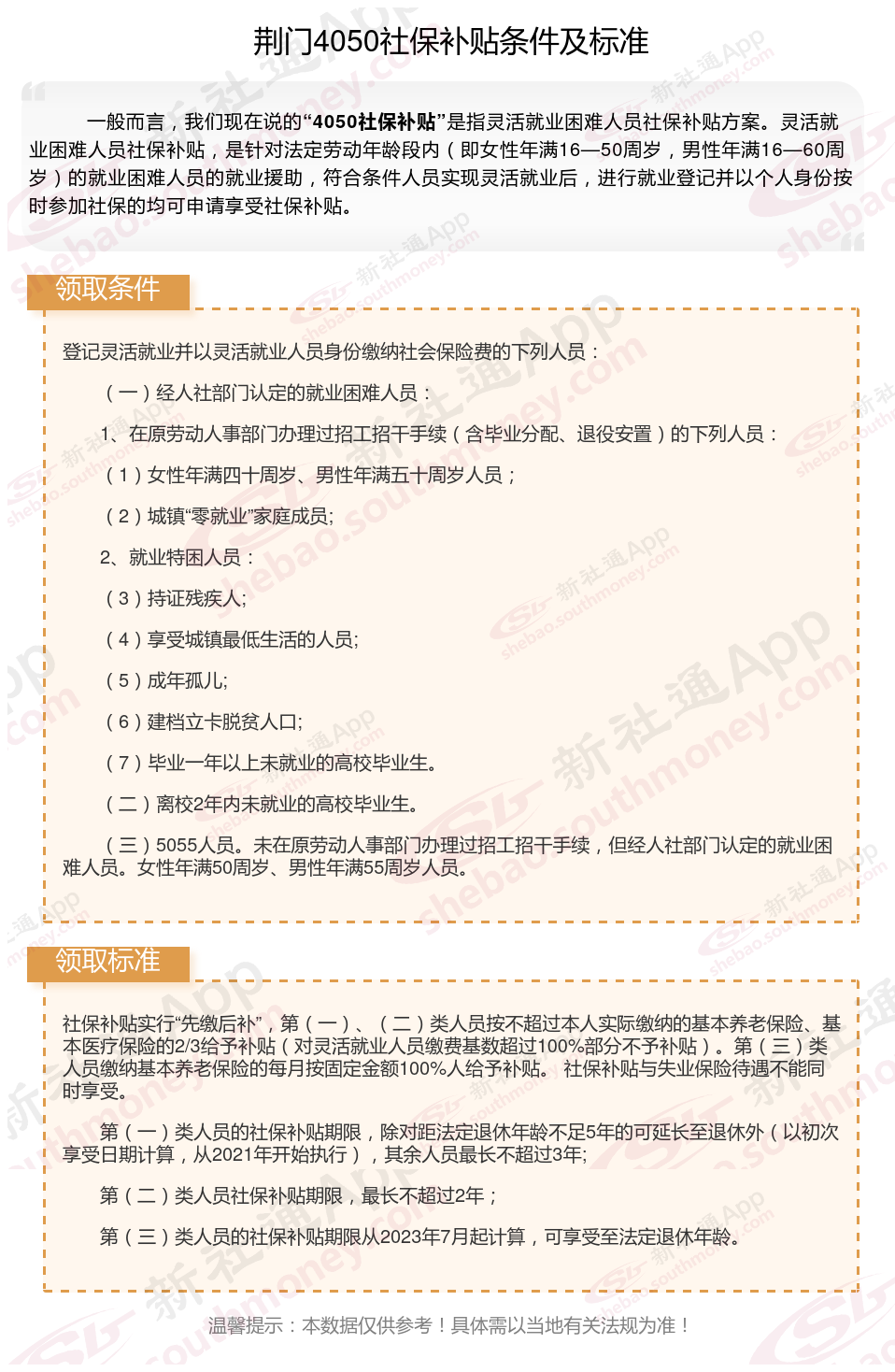 以上就是荆门4050灵活就业困难人员社保补贴的相关内容,欢迎关注新社通/下载新社通APP了解更多五险一金专业资讯。