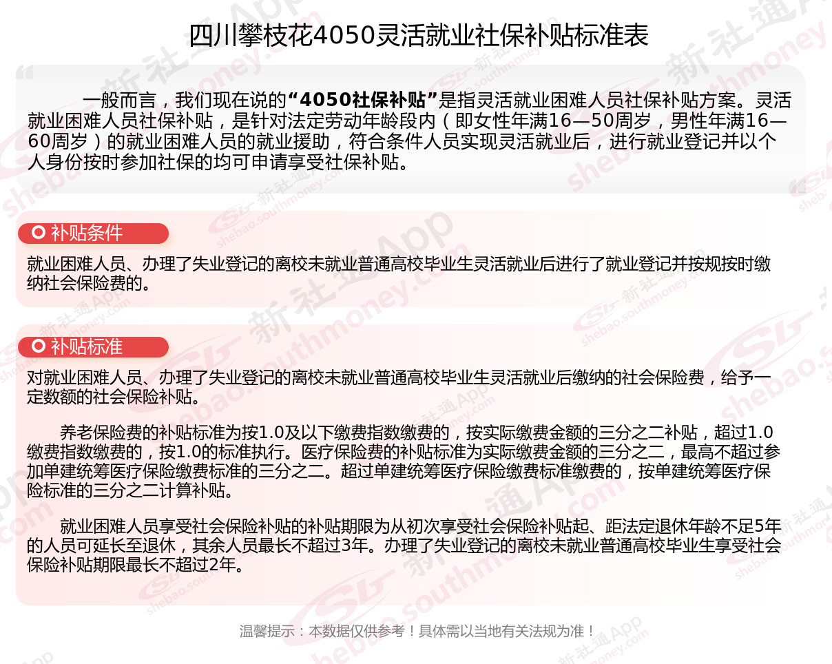 二、四川攀枝花4050社保补贴标准及条件2025年,最新如下