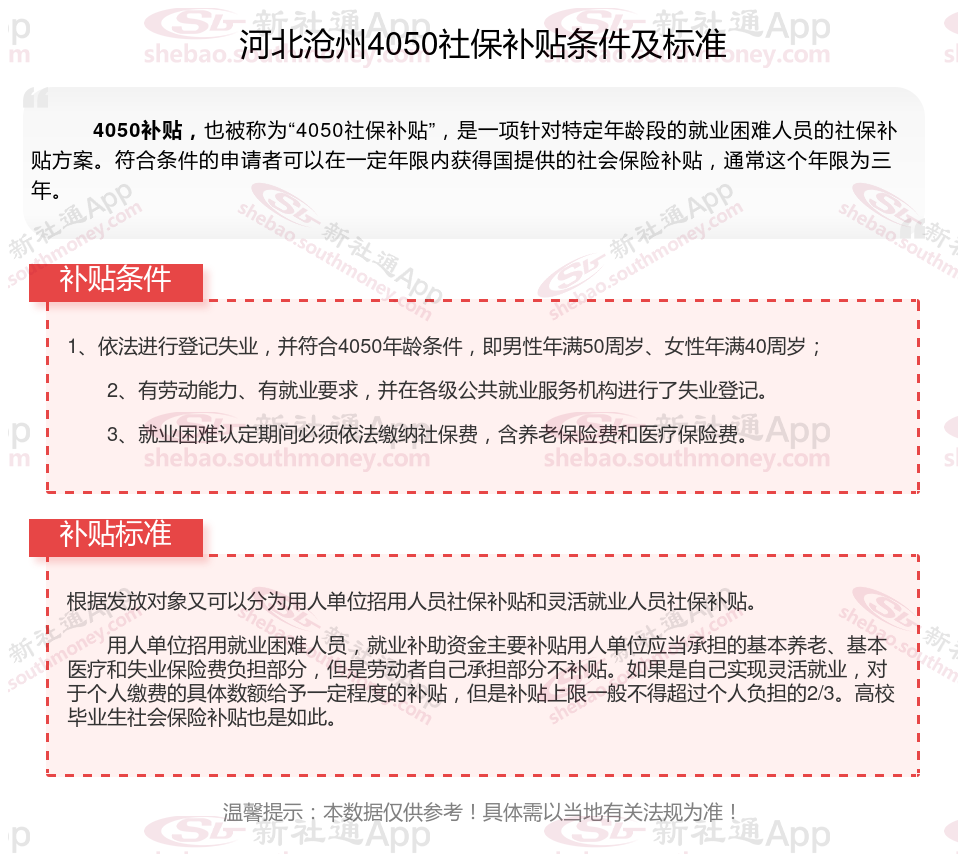 一、河北沧州4050社保补贴标准及条件2025年最新消息