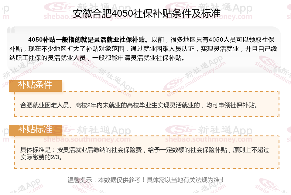 二、2025年安徽合肥4050社保补贴标准及条件,最新如下: