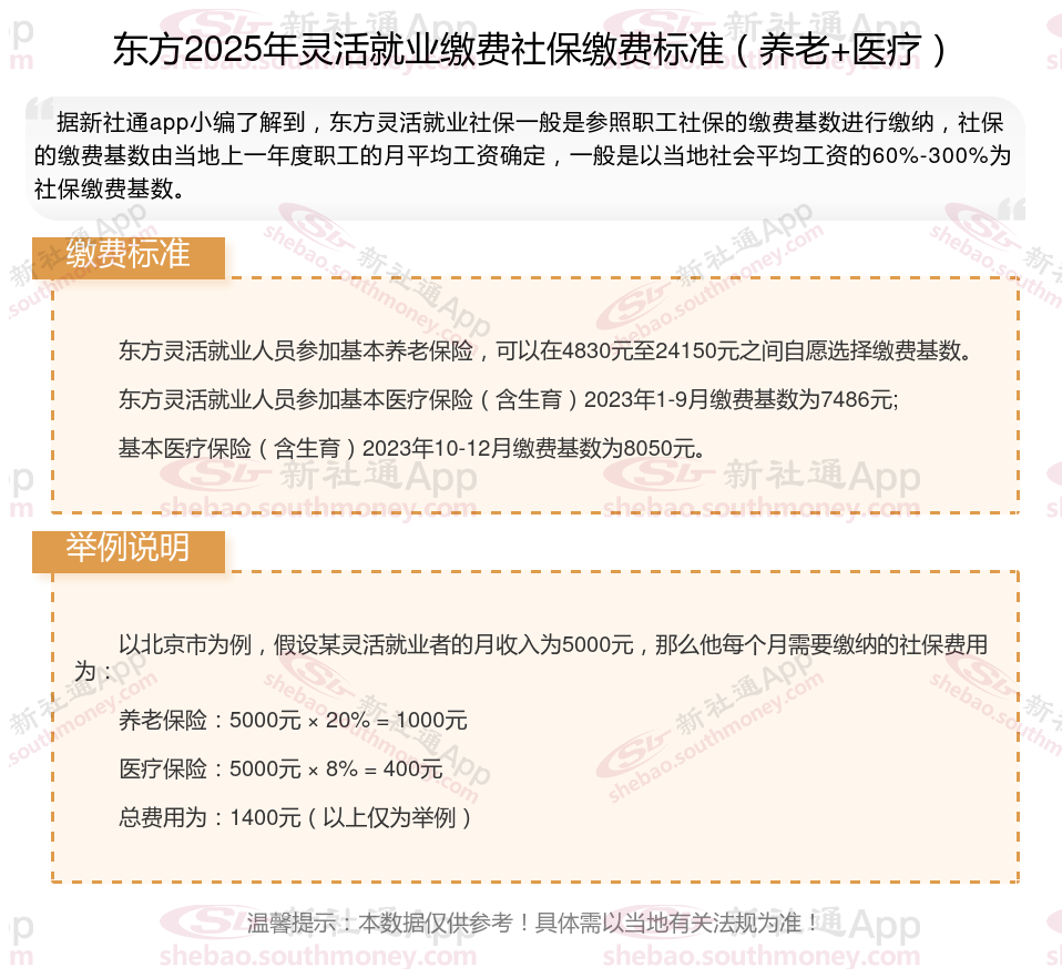 据新社通app数据显示,东方灵活就业养老保险缴费基数2024-2025年最新标准如下: