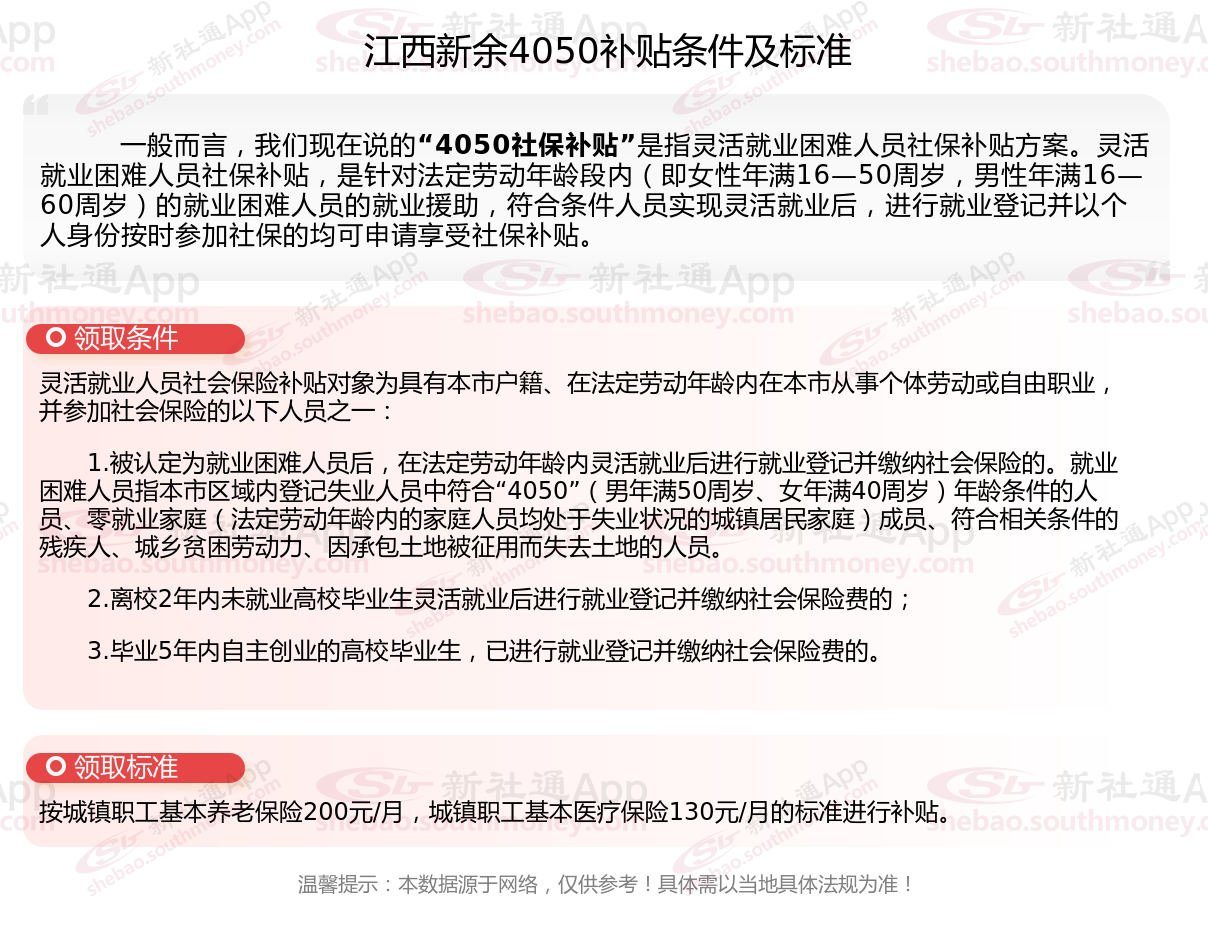 二、2025年江西新余4050社保补贴标准及条件是什么?