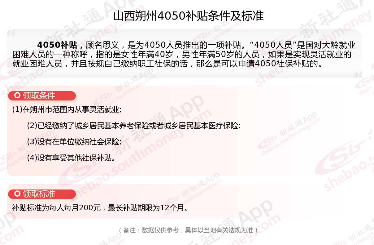 4050社保补贴标准据新社通app小编了解,通常,4050社保补贴包含基本医疗保险和基本养老保险两个险种,社保补贴金额为申请人实际缴纳基本养老保险和基本医疗保险金额的2/3,具体标准以当地社保局公布的数据为准!那么山西朔州4050灵活就业困难人员社保补贴标准是多少?山西朔州4050社保补贴需要符合什么条件?接下来随新社通APP小编具体了解一下4050社保补贴内容。