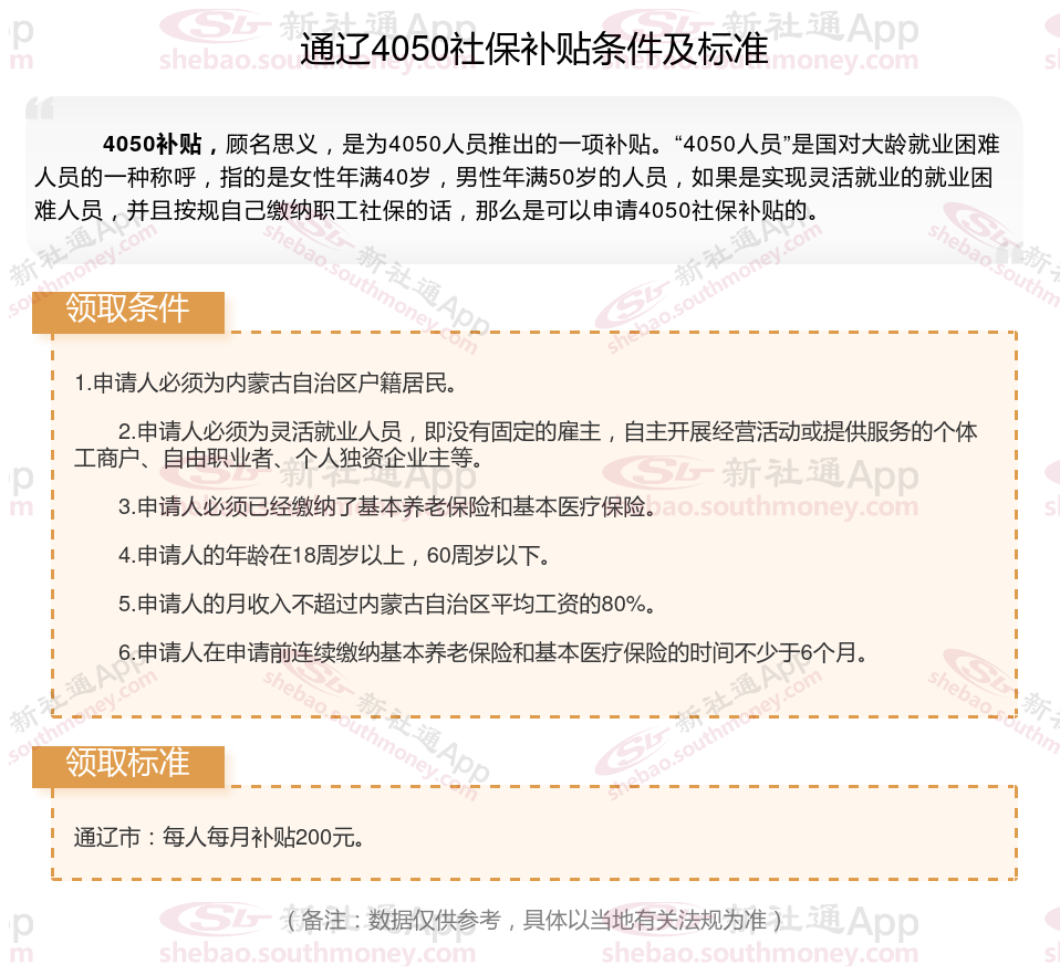 二、2025年通辽4050社保补贴标准是多少?领取条件是什么?