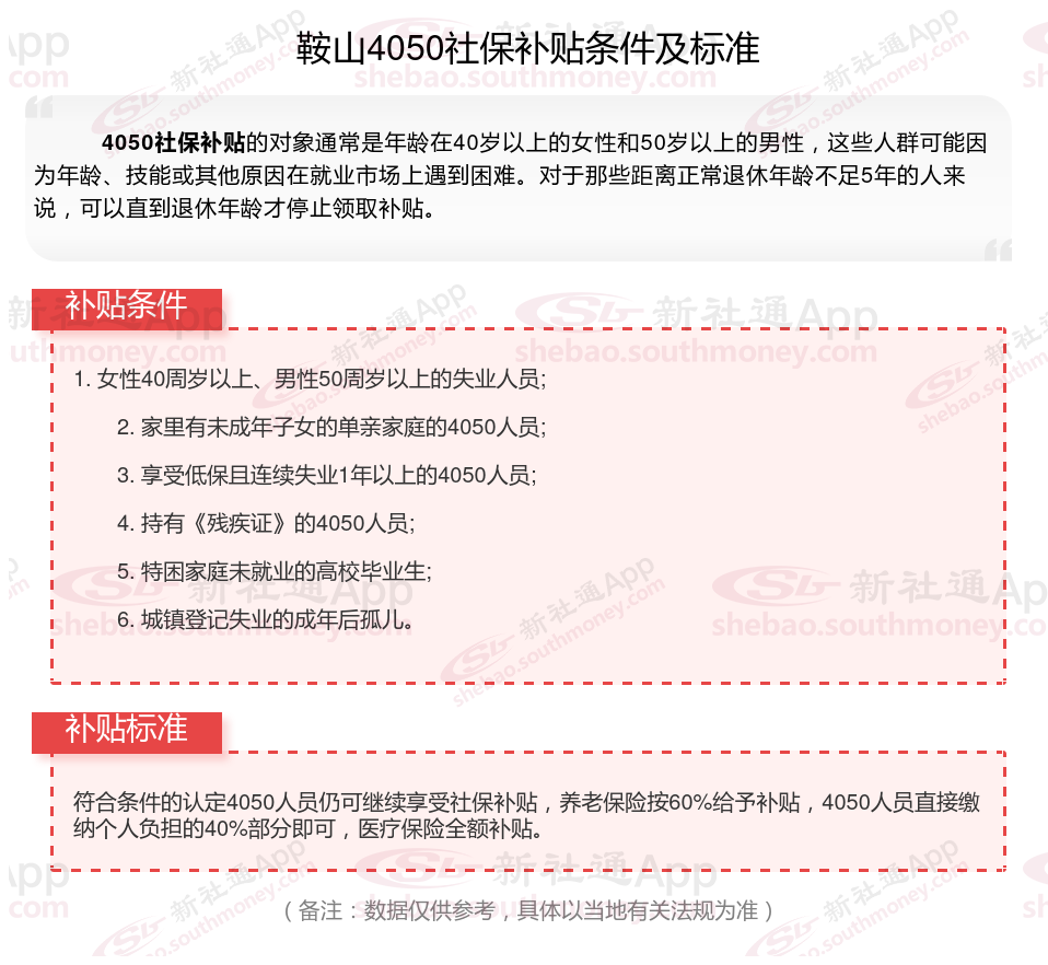2025鞍山4050补贴主要针对的是年龄在40岁以上的女性和50岁以上的男性,这些人群通常因为年龄较大而面临就业困难。