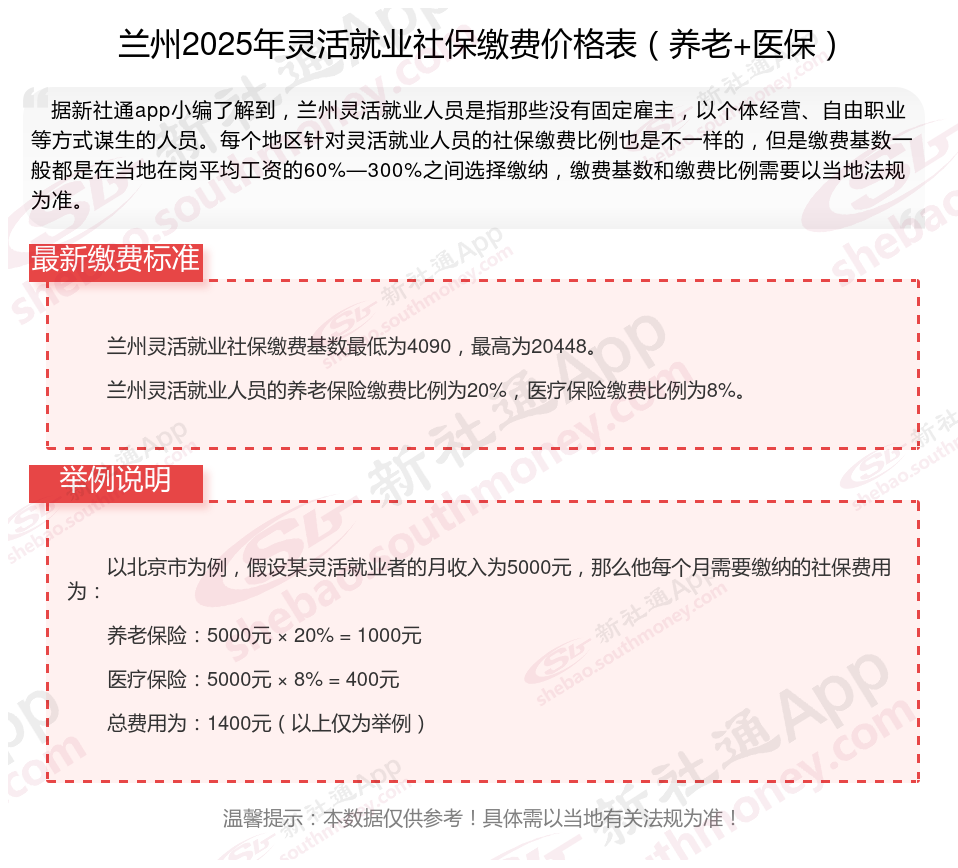 2025年兰州灵活就业人员社保需要交多少钱?2025灵活就业社保是指针对灵活就业人员的社会保险制。灵活就业人员包括个体经营者、自由职业者、临时工等,他们没有固定的雇主,因此需要自行缴纳社会保险。接下来随新社通APP小编一起来看看。