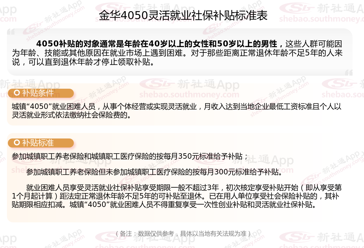 2025金华灵活就业4050社保补贴是一项面向特定年龄段的就业困难人群的社会保险补贴。