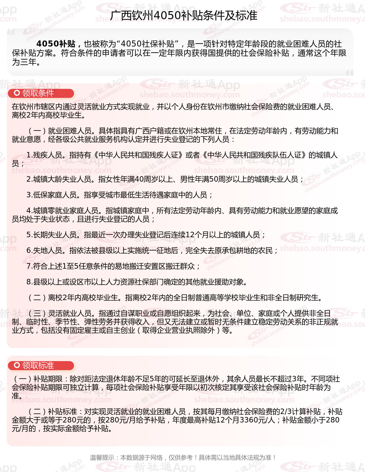 二、2025年广西钦州4050社保补贴标准及条件,最新如下: