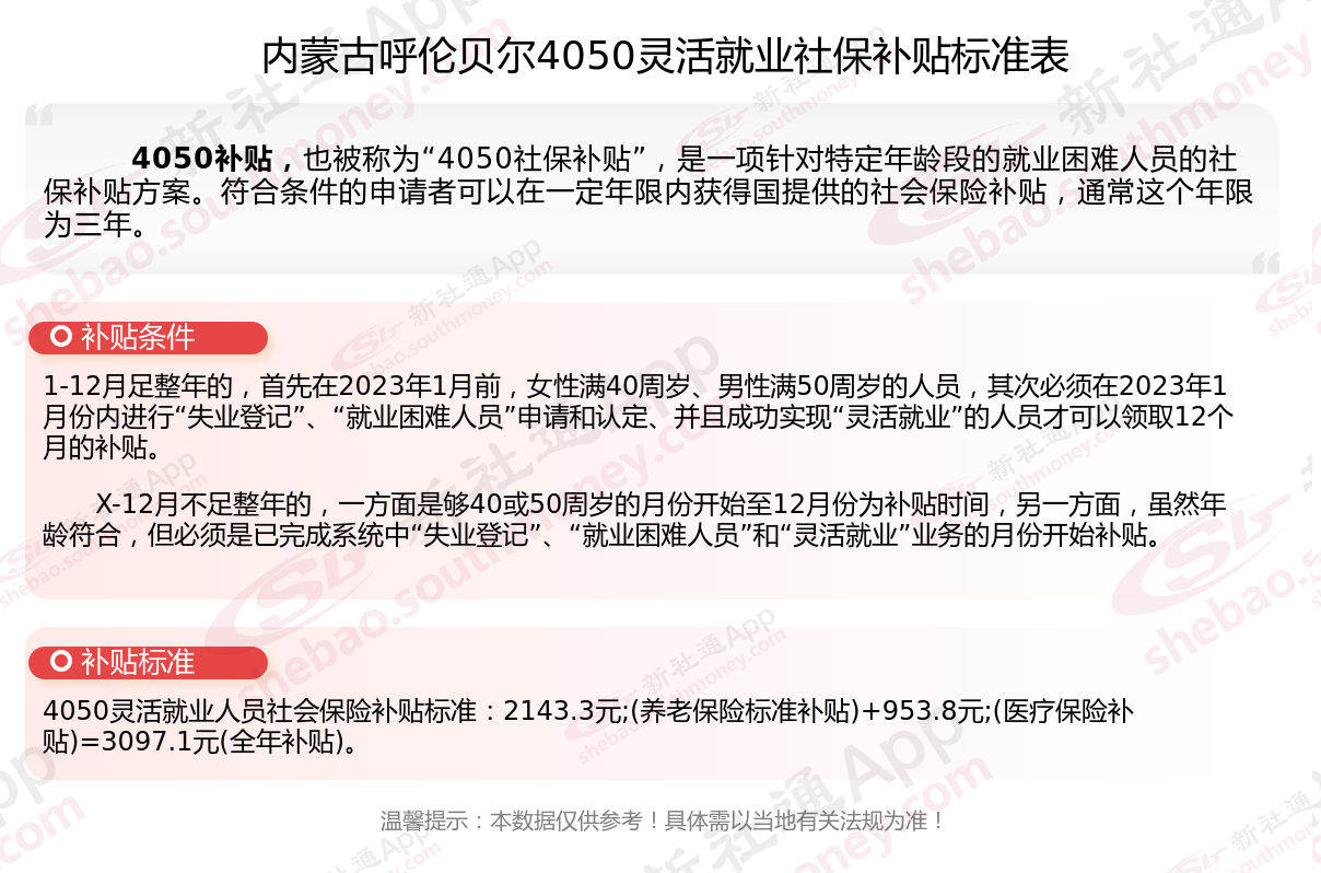 一、2025年内蒙古呼伦贝尔4050社保补贴标准及条件是多少?