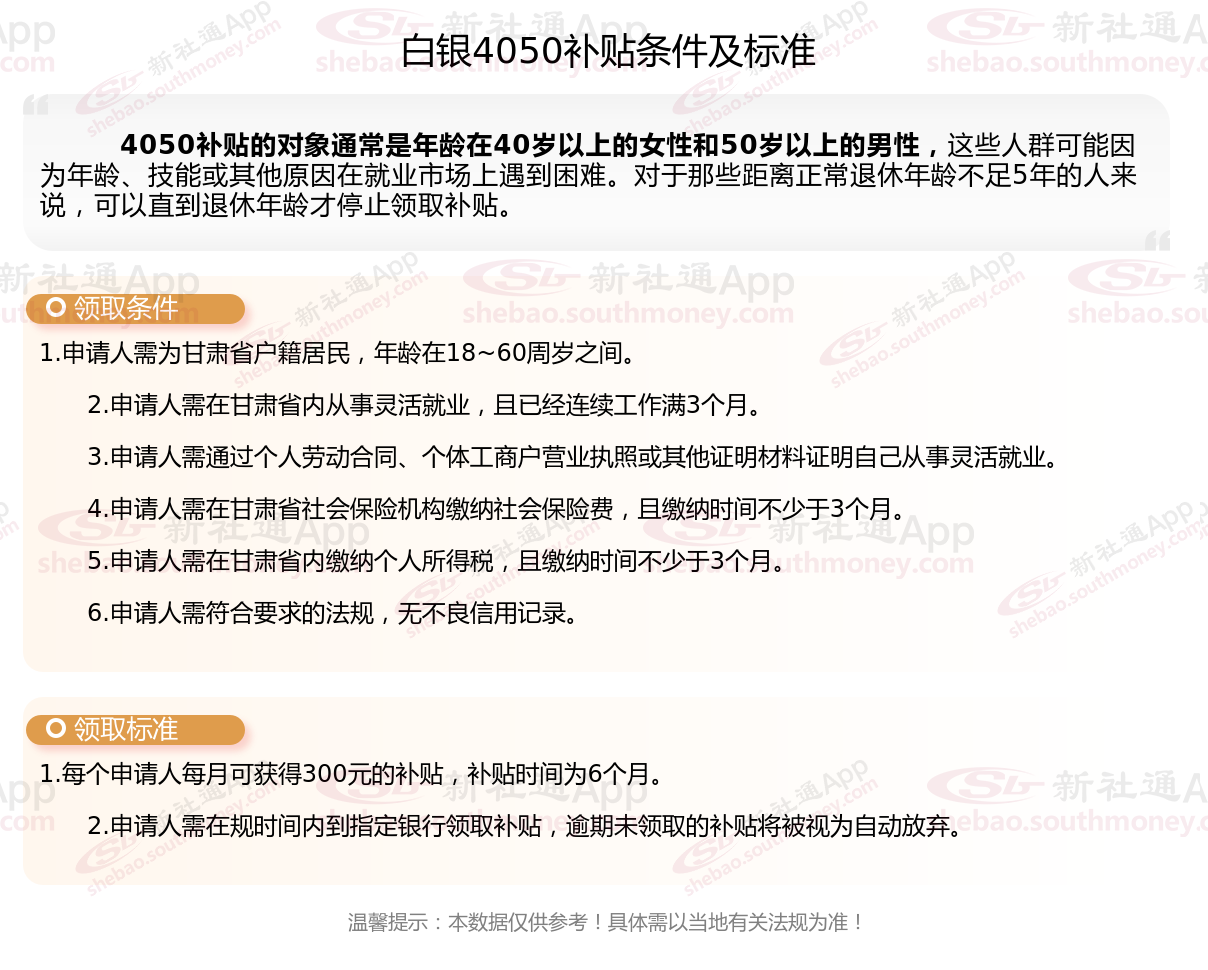 白银4050社保补贴多少钱一个月?白银4050社保补贴2025年最新标准是多少?2025白银4050补贴主要针对的是年龄在40岁以上的女性和50岁以上的男性,这些人群通常因为年龄较大而面临就业困难。