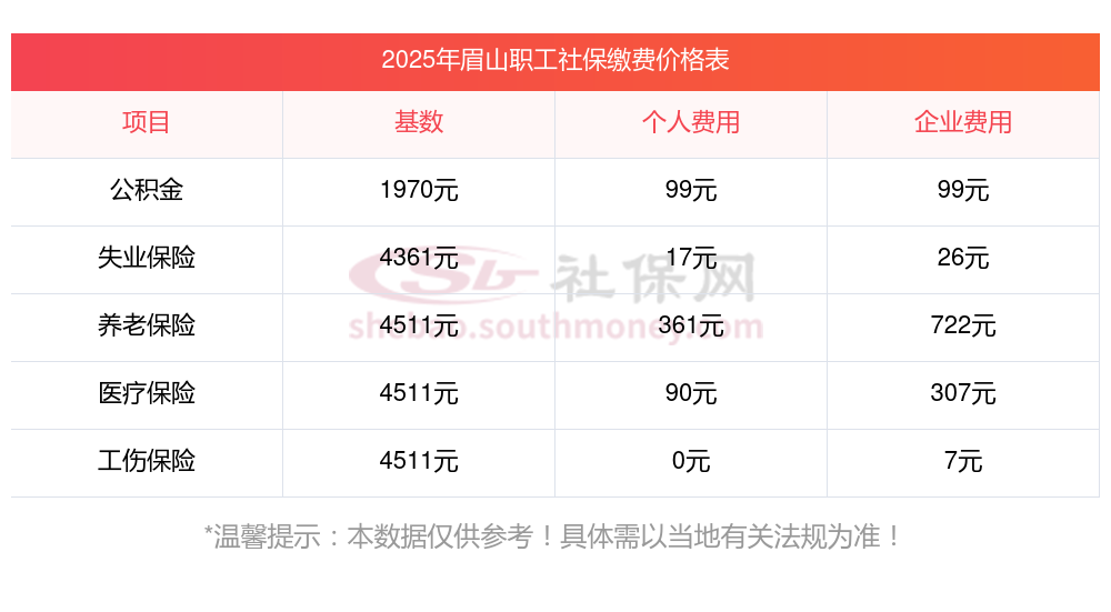 眉山社保多少钱一个月?下面和社保网-APP一起来看看2025年眉山最低标准社保费用明细参考,新社通app-社保缴费查询工具提供的最新数据如下: