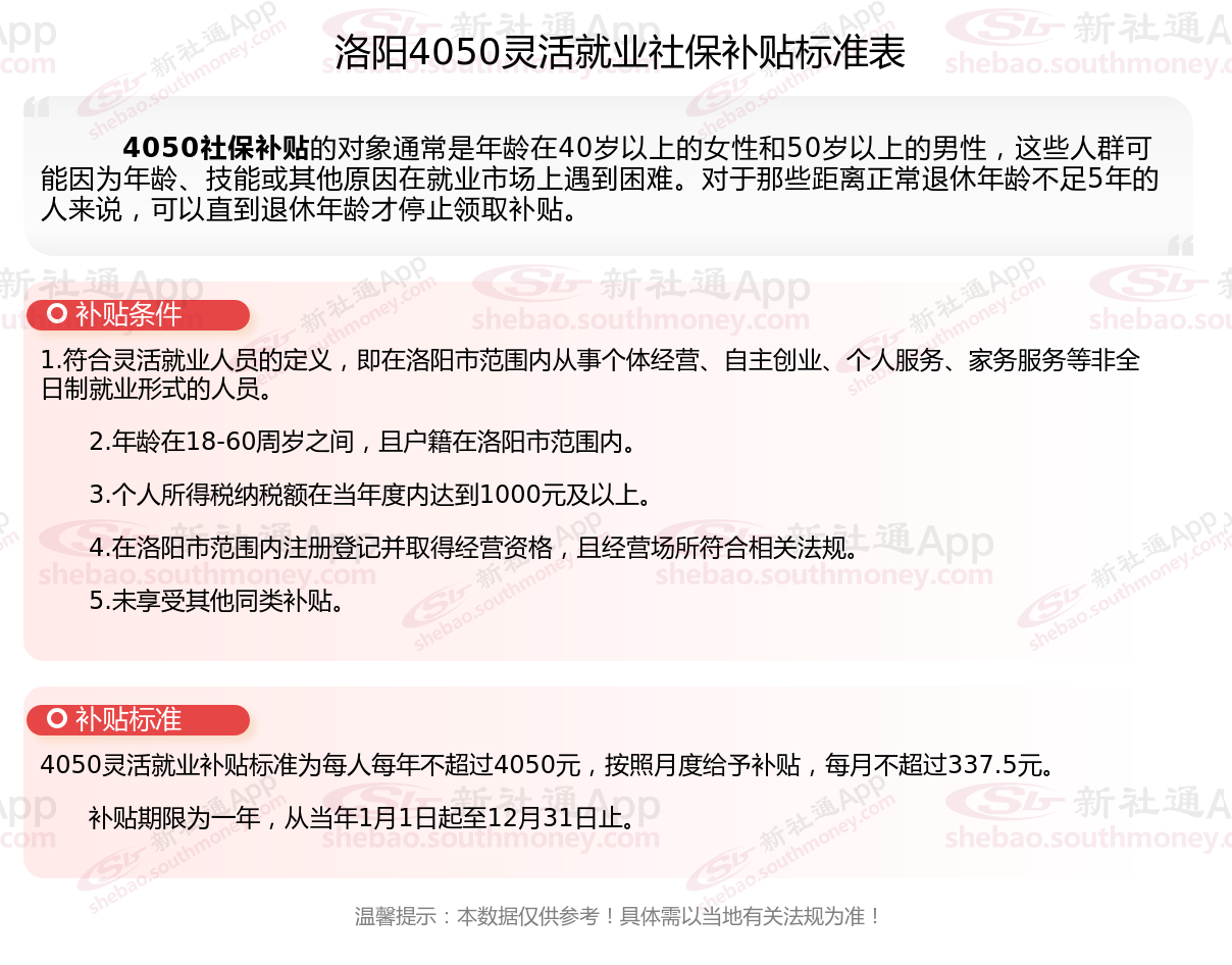 “灵活就业4050社保补贴”需要以灵活就业身份参加职工养老和医疗保险,补贴标准不超过实际缴费的三分之二,最长3年,距离退休不足5年的可延长到退休。补贴对象包括国企下岗人员、低保家庭等。申请流程需要提交身份证、银行账户等。那么洛阳4050灵活就业困难人员社保补贴标准是多少?洛阳4050社保补贴需要符合什么条件?接下来随新社通APP小编具体了解一下4050社保补贴内容。