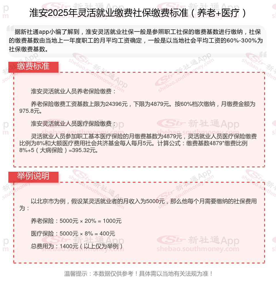 那么,淮安灵活就业者社保一个月需要交多少钱?根据新社通app-社保缴费查询工具提供的2025社保缴费标准详情数据: