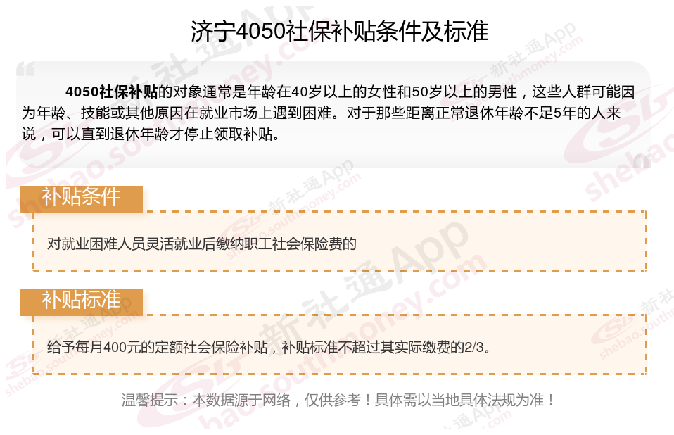 2025济宁4050补贴主要针对的是年龄在40岁以上的女性和50岁以上的男性,这些人群通常因为年龄较大而面临就业困难。