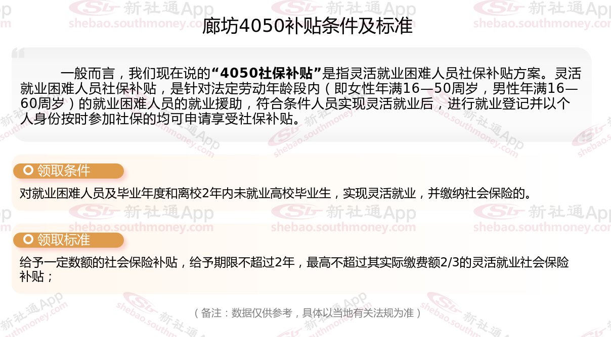 一、2025年廊坊4050社保补贴标准及条件是多少?