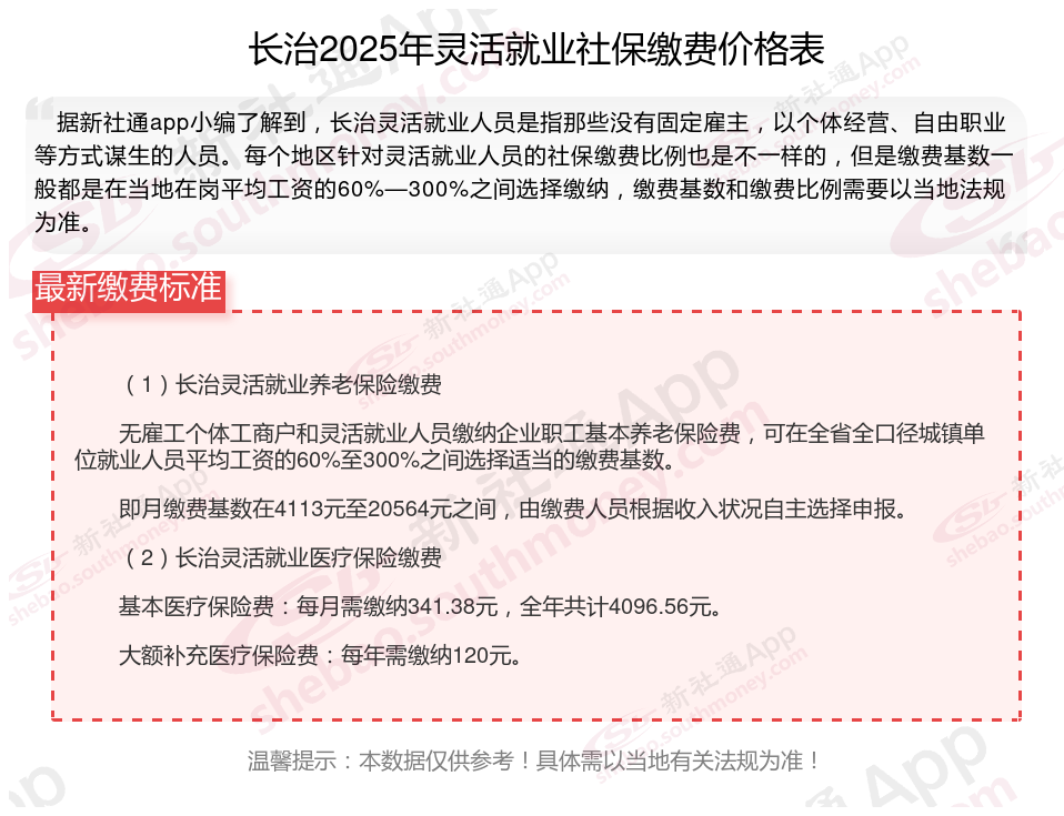 一、2025年长治灵活就业社保缴费标准公布啦 长治灵活就业社保多少钱一个月?