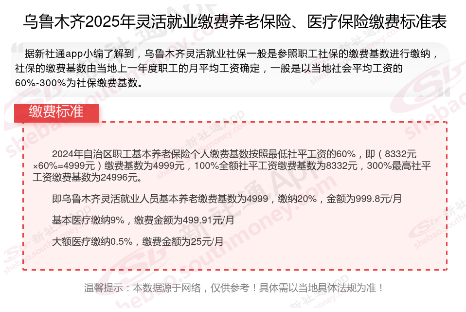 那么,乌鲁木齐灵活就业人员社保一个月需要交多少钱?根据新社通app-社保缴费查询工具提供的2025社保缴费标准详情数据: