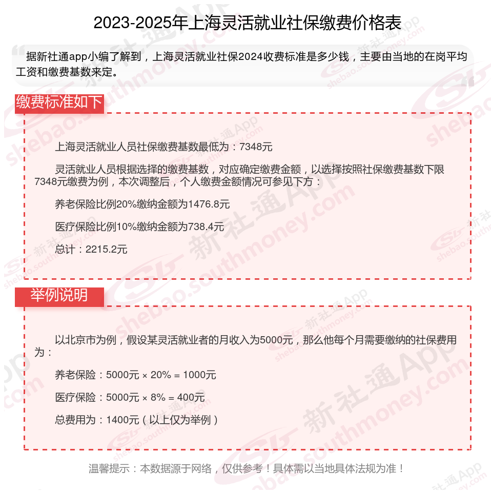 那么,灵活就业者社保是多少钱一个月 上海灵活社保交多少钱?根据新社通app-社保缴费查询工具提供的2025社保缴费标准详情数据: