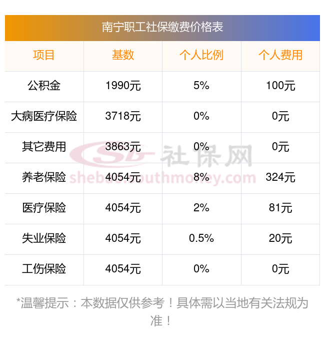 南宁社保一个月交多少钱,个人缴纳多少钱一个月?下面和新社通一起来看看南宁最低标准社保费用明细参考,新社通app-社保缴费查询工具提供的最新数据如下: